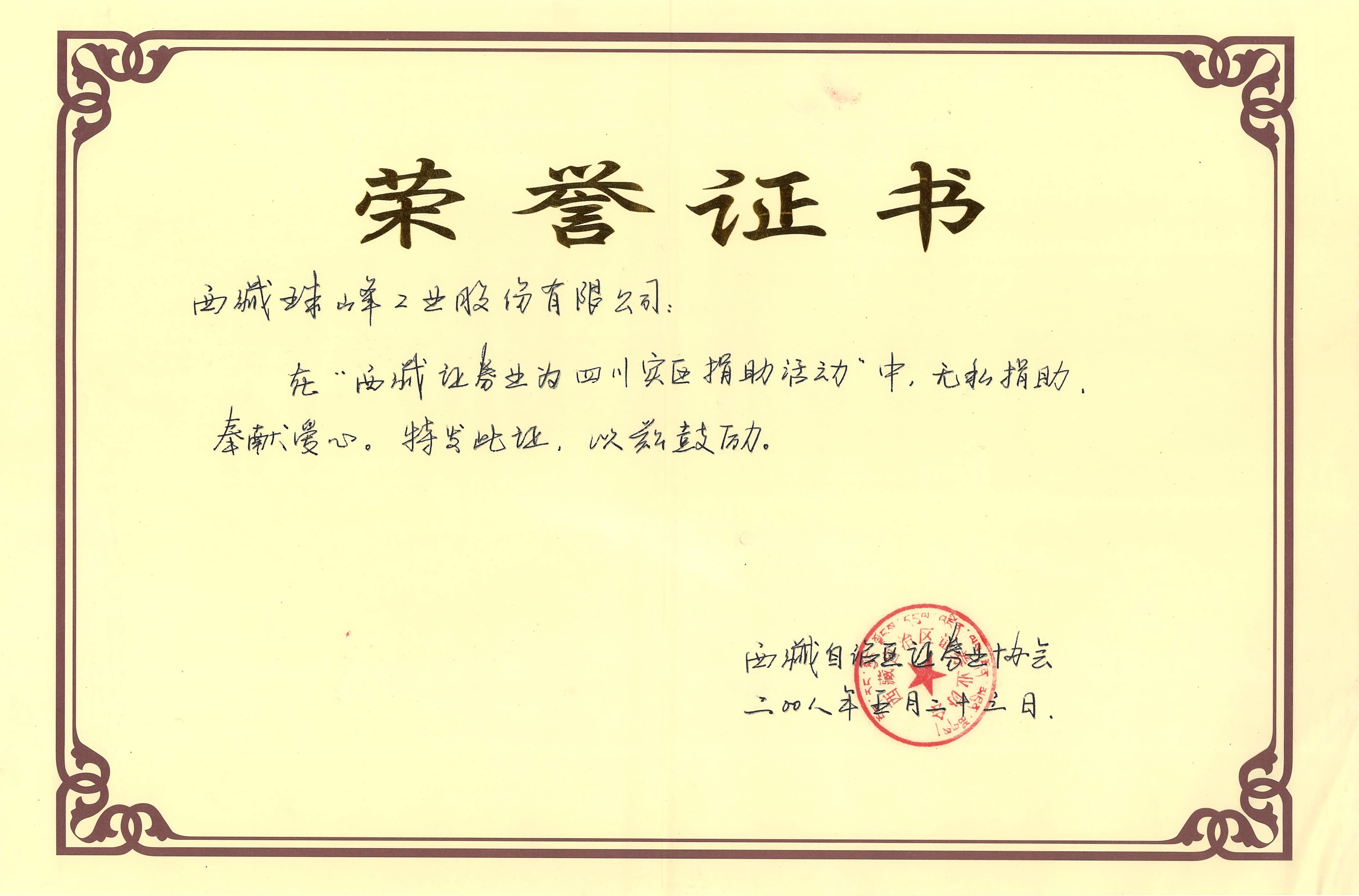 四川災區(qū)捐助活動榮譽證書